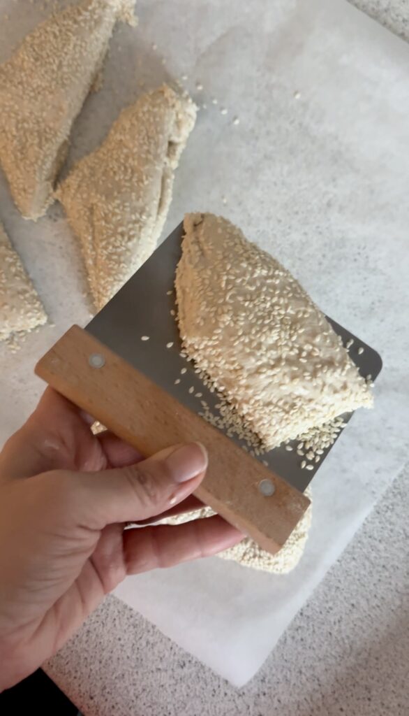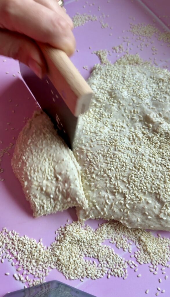 - Fordel sesam frø på bordet og hæld dejen ud derpå