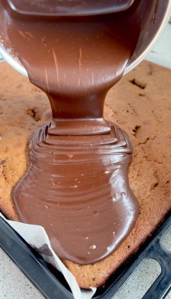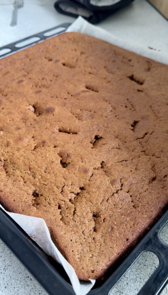 - Prik huller i kagen med en gaffel (så vil glasuren trænge ned i kagen og gøre den ekstra svampet)