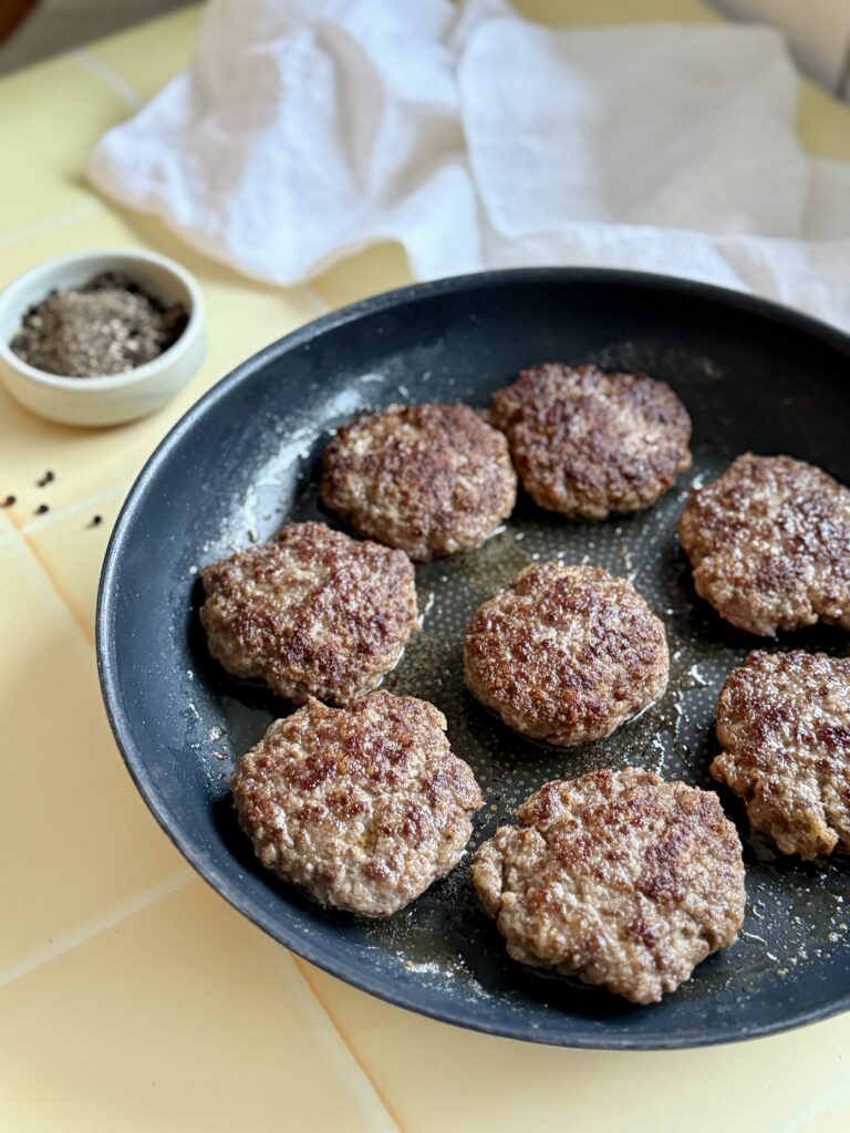 Hakkebøfferne er lavet af helt almindeligt hakket oksekød og stegt på panden, så de får en god stegeskorpe. Når bøfferne er taget af, laver du den lækre, brunede pandesovs direkte i stegefedtet – så får du den autentiske smag, der binder hele retten sammen. Det er sådan noget, der gør en forskel, uden at det kræver ekstra arbejde.