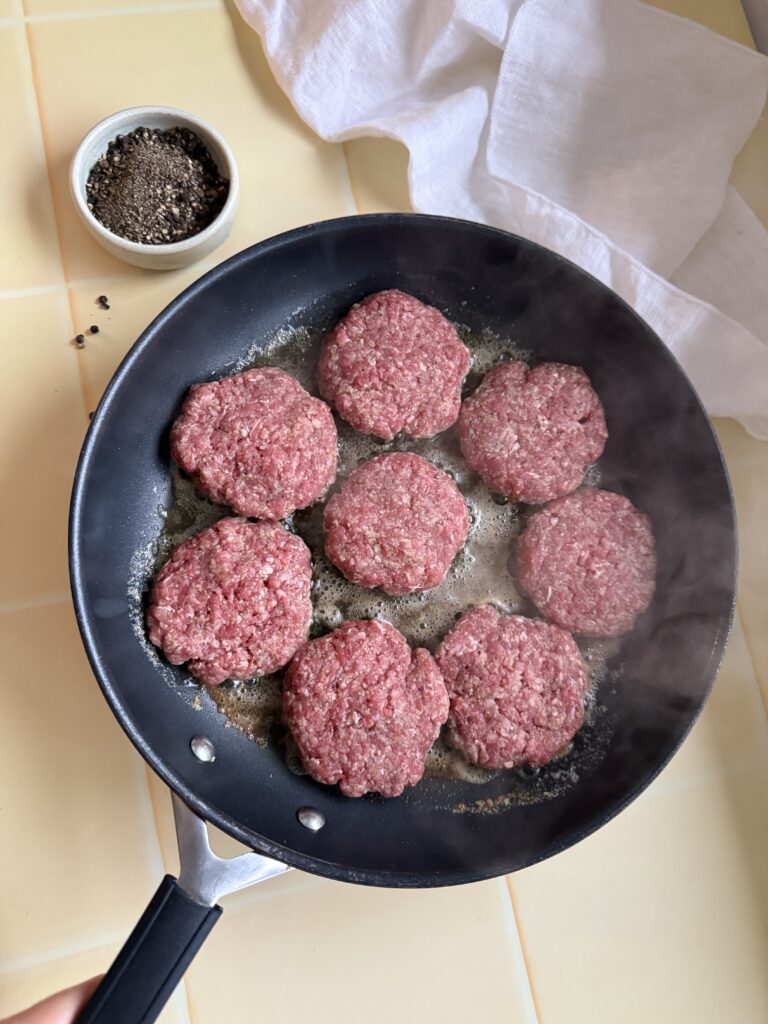 - Form kødet til 8 små hakkebøffer. Krydr med salt og peber