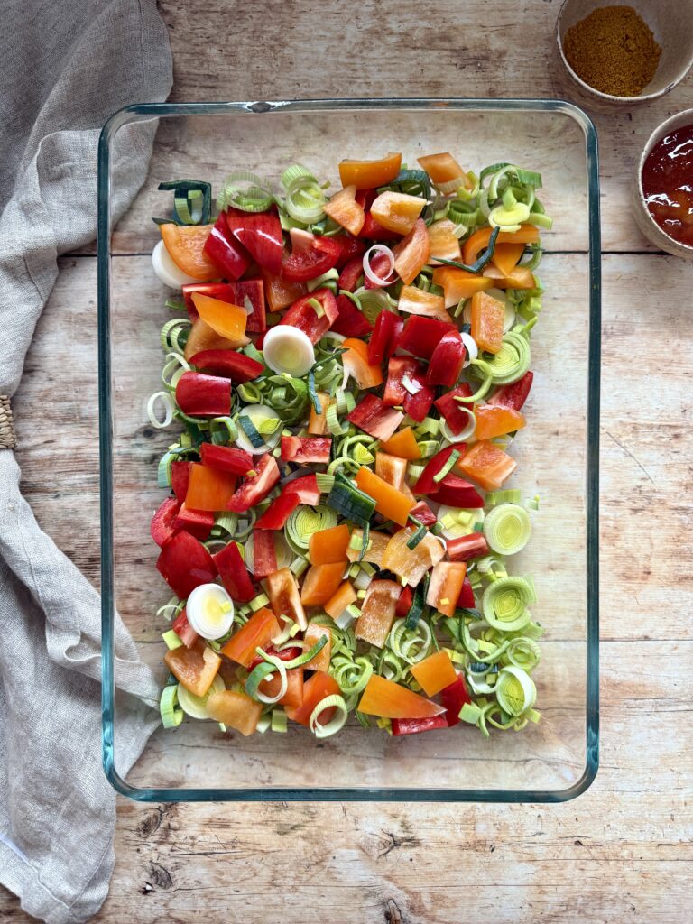 - I et ildfast fad fordeles peberfrugt, porrer og hvidløg