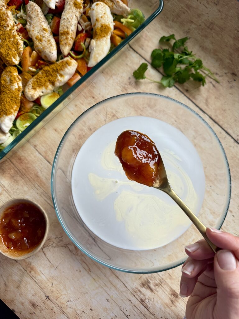 - I en skål piskes mangochutney, kokosmælk og piskefløde sammen