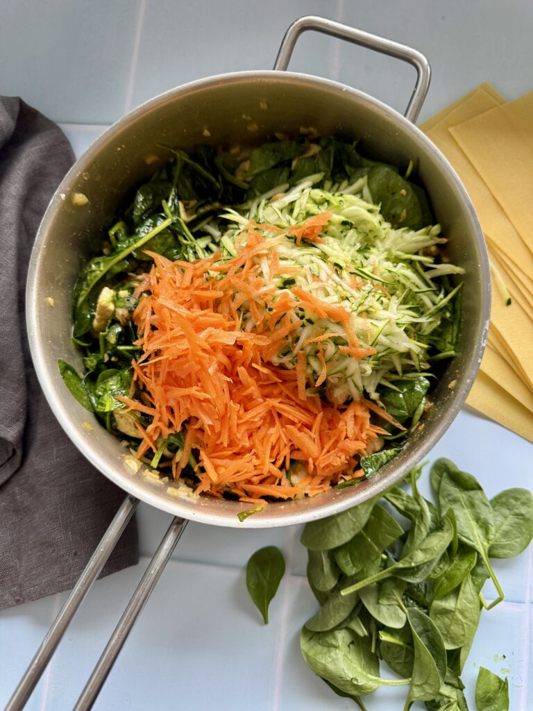 - Tilsæt nu spinat, squash og gulerødder. Steg yderligere et par min.