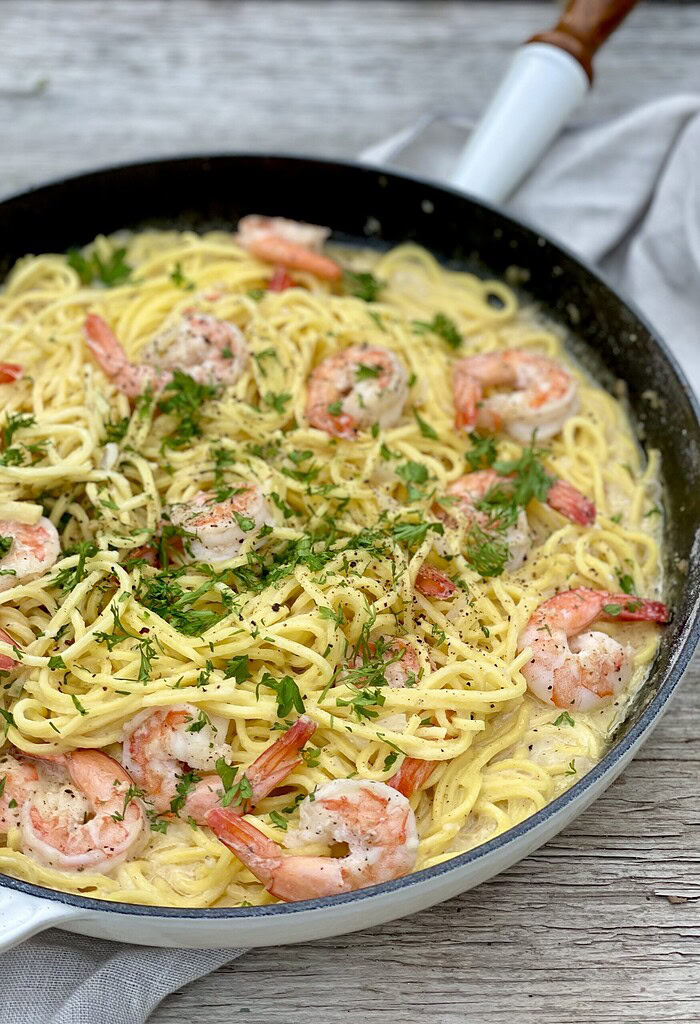 Tigerrejer, flødesovs og frisk pasta