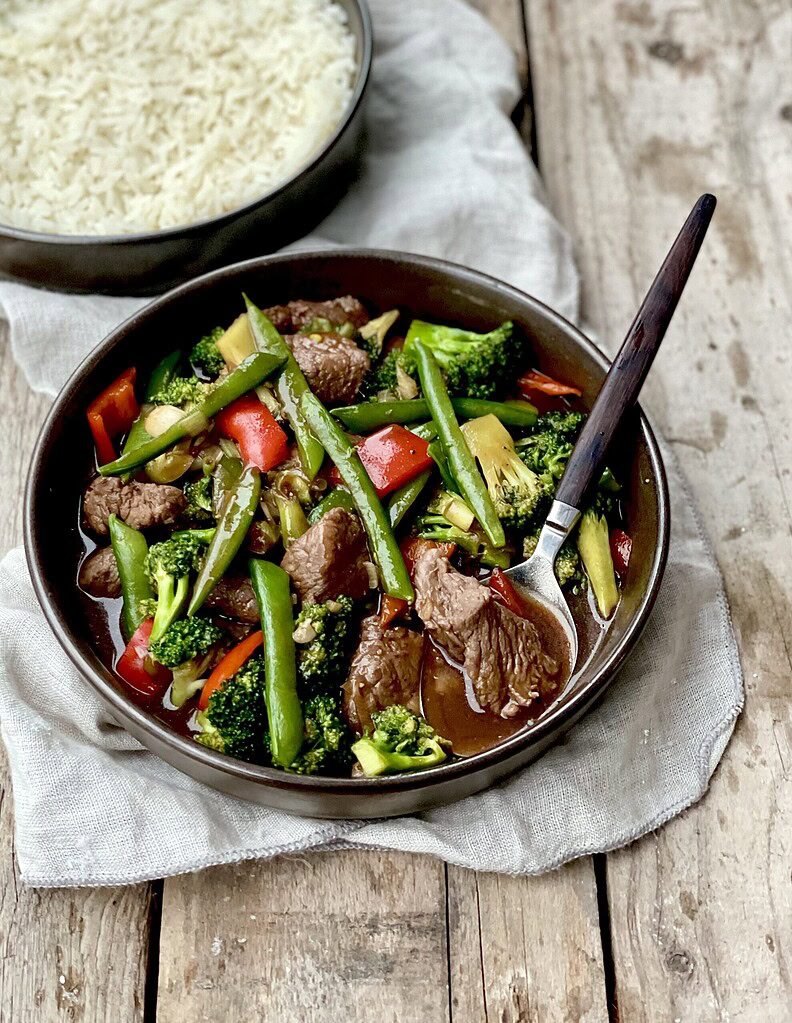 Oksekød og grønt i østerssovs