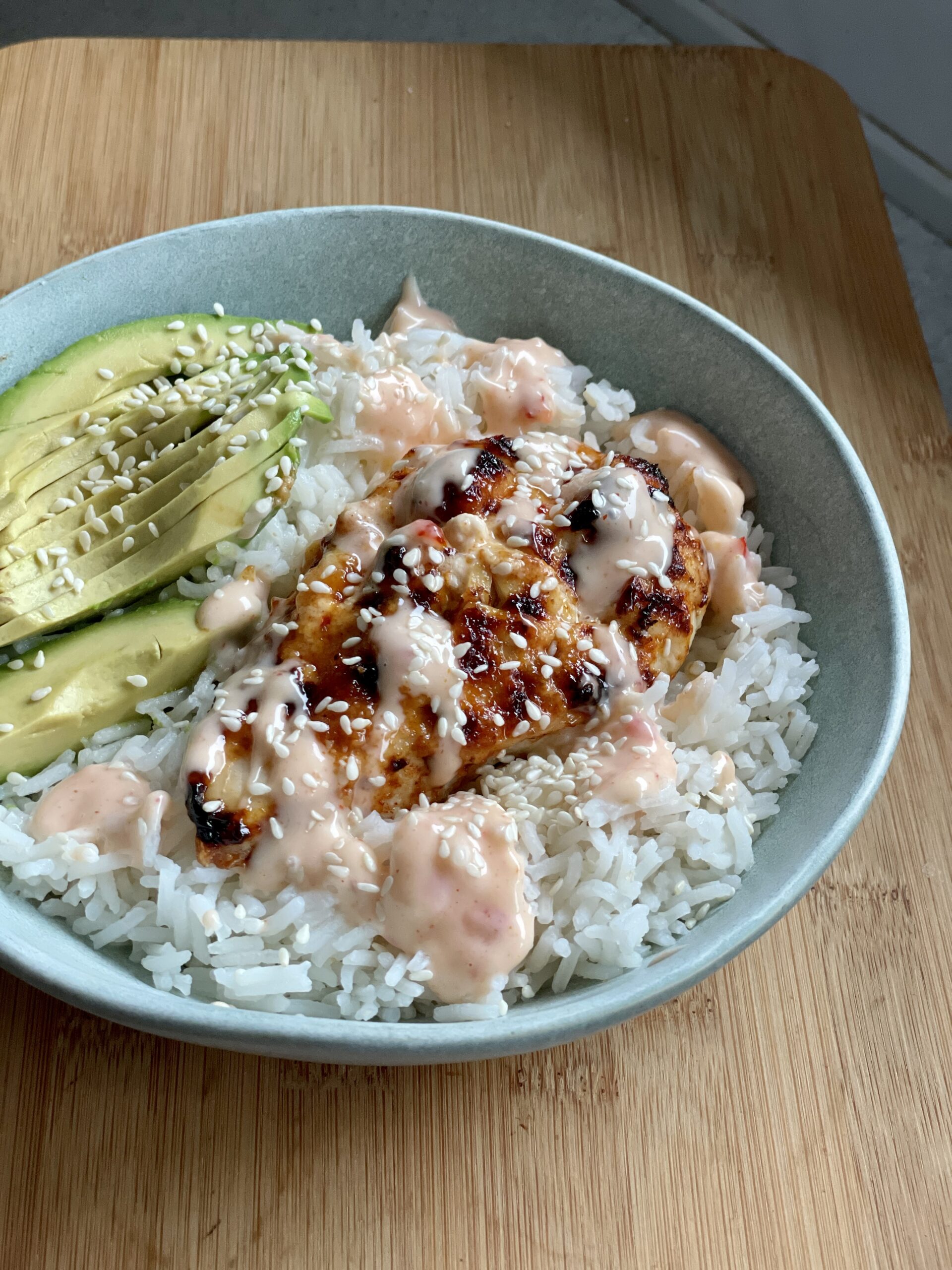 • Bland ingredienserne til bang bang kylling i en anden skål og fordel/pensl ca. 1/2 af sovsen ud på de 4 stykker kylling