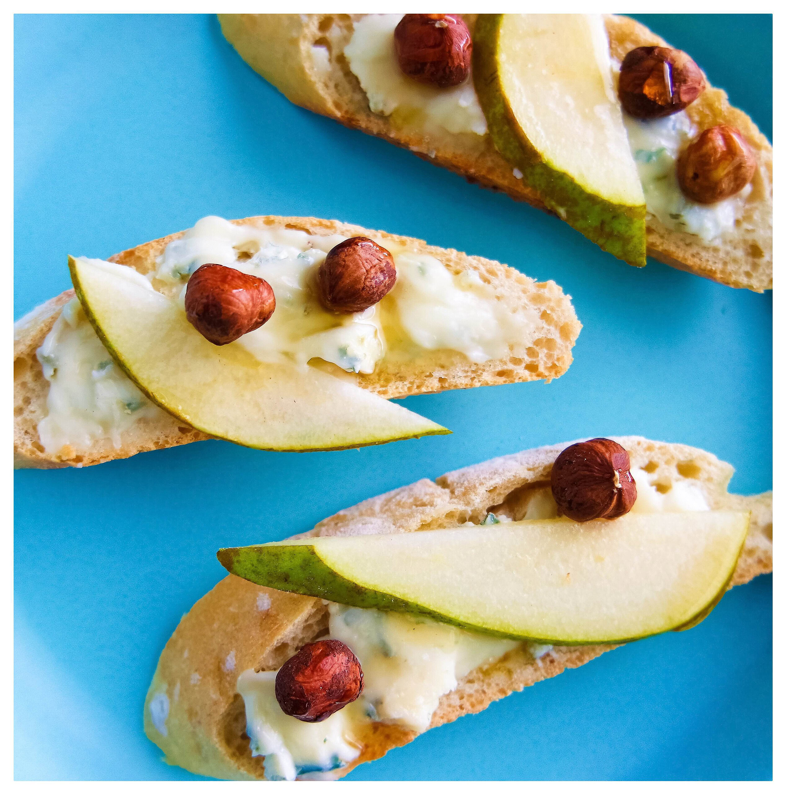 - Smør brødskiverne med gorgonzolaen. Kom derefter de tynde pæreskiver på. Kom 2 hasselnødder på hver skive og kom en tynd stribe honning /ca.1/2 tsk pr skive over nødderne til slut.