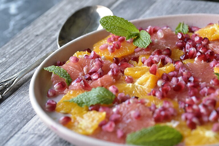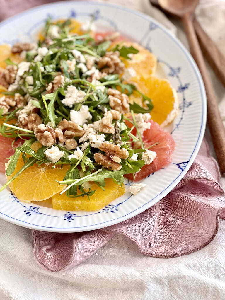 Jeg er vild med den her skønne syrlige salat, som eks. vil være god til fed mad. Her en variant med granatæble på toppen, lækkert og farverigt 🙂