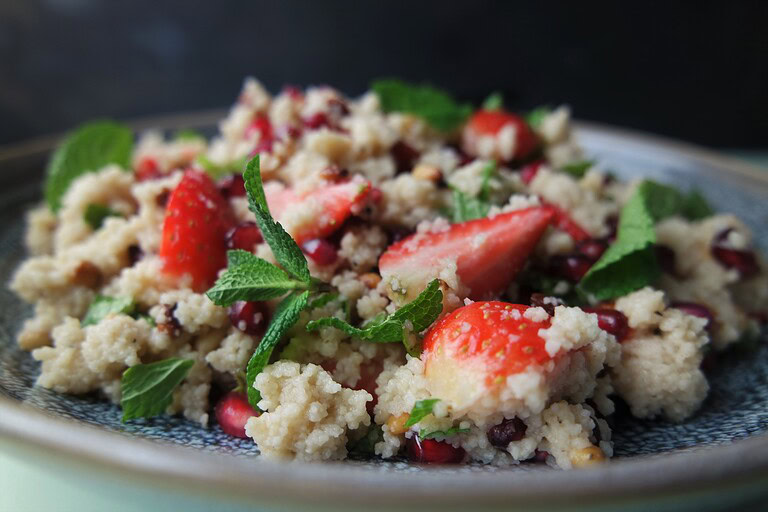 - Bland den afkølede couscous med jordbær, mynte, pinjekerner og granatæble.