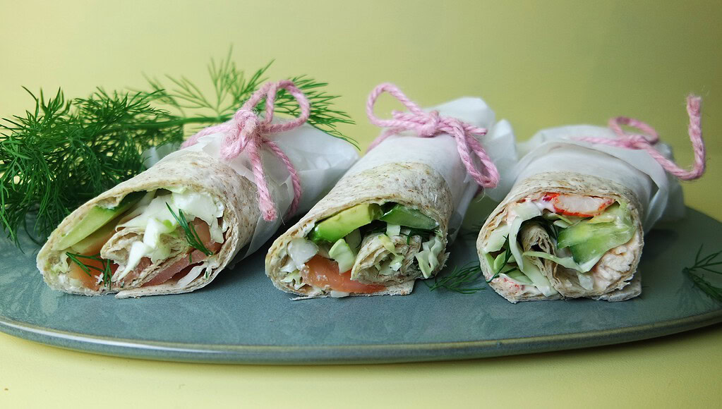 Tortilla med laks eller krebsesalat