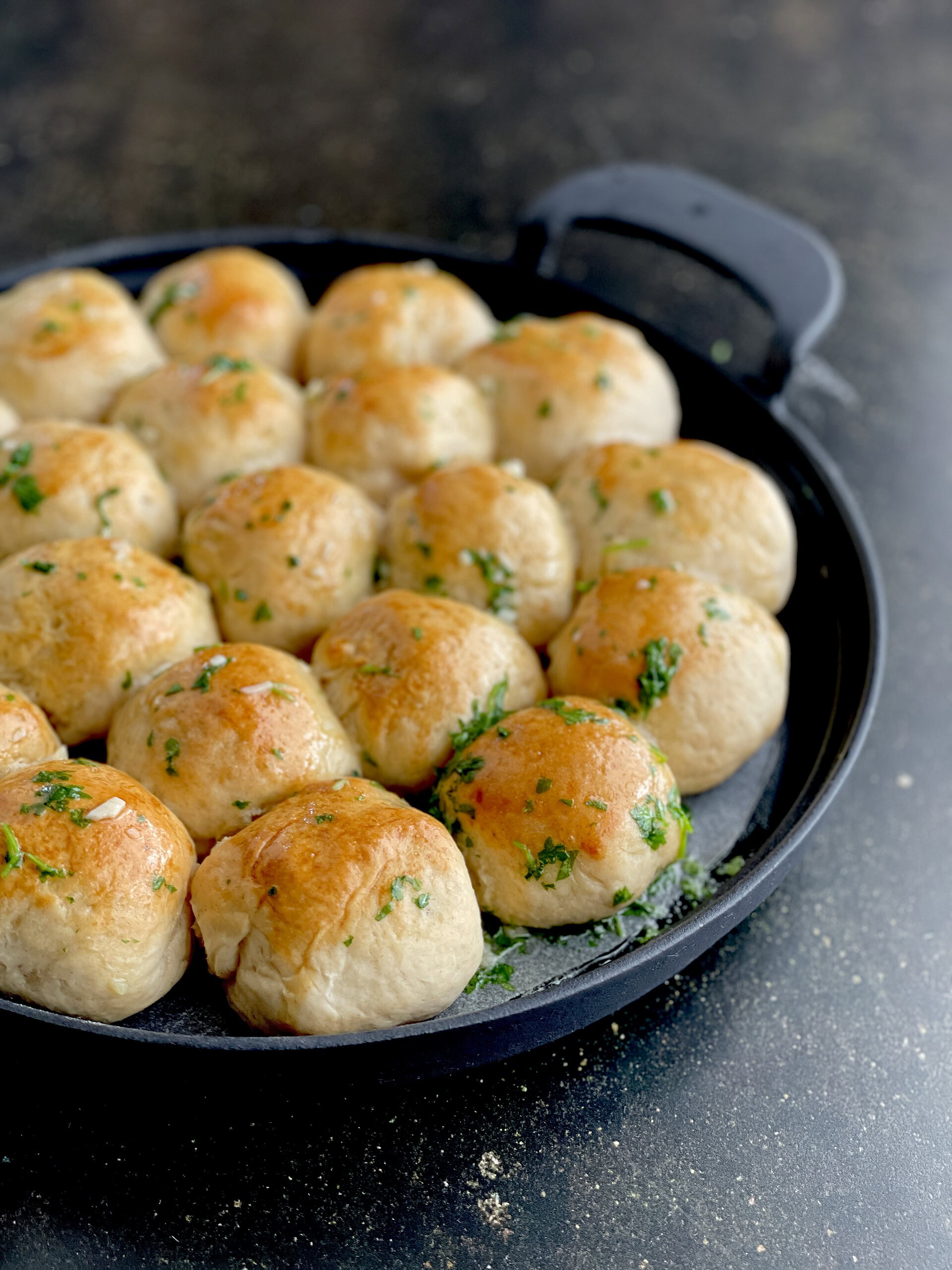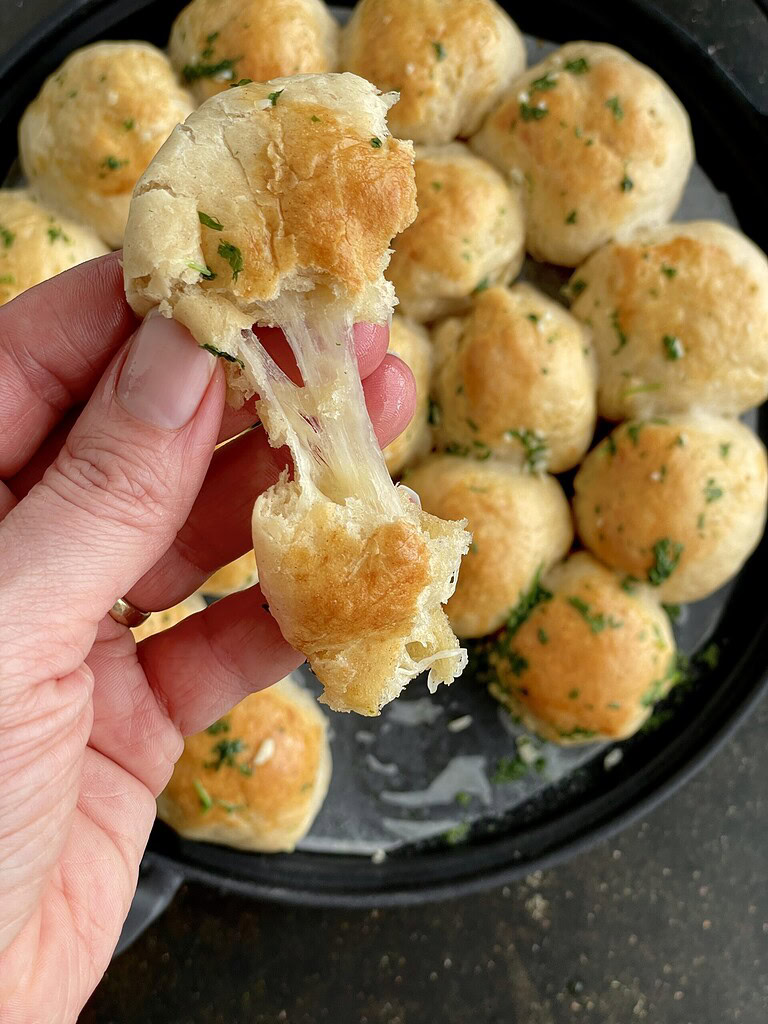 De fleste jeg kender elsker et lunt hvidløgsflute, men skal du servere luksus udgaven – så prøv at lave de her lækre boller. Udover hvidløgssmørret på toppen, så bliver man forkælet med smeltet ost indeni. Super lækre som tilbehør til det meste: gæstemad, kylling og en god salat, til suppe, grillmad eller til tapas.