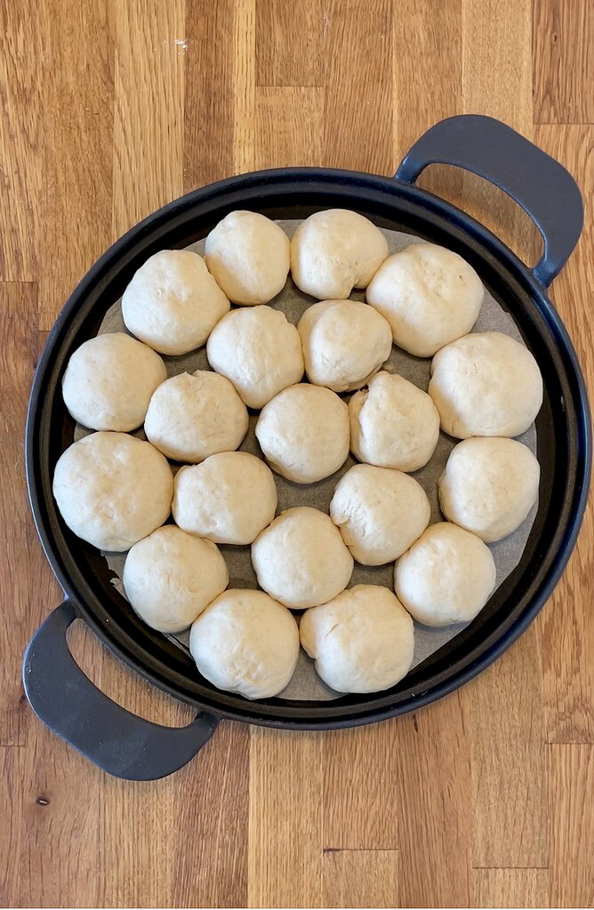 - Kom i et fad med bagepapir og stil dem tæt (dog uden at røre hinanden). Lad hæve under viskestykke i 30 min.