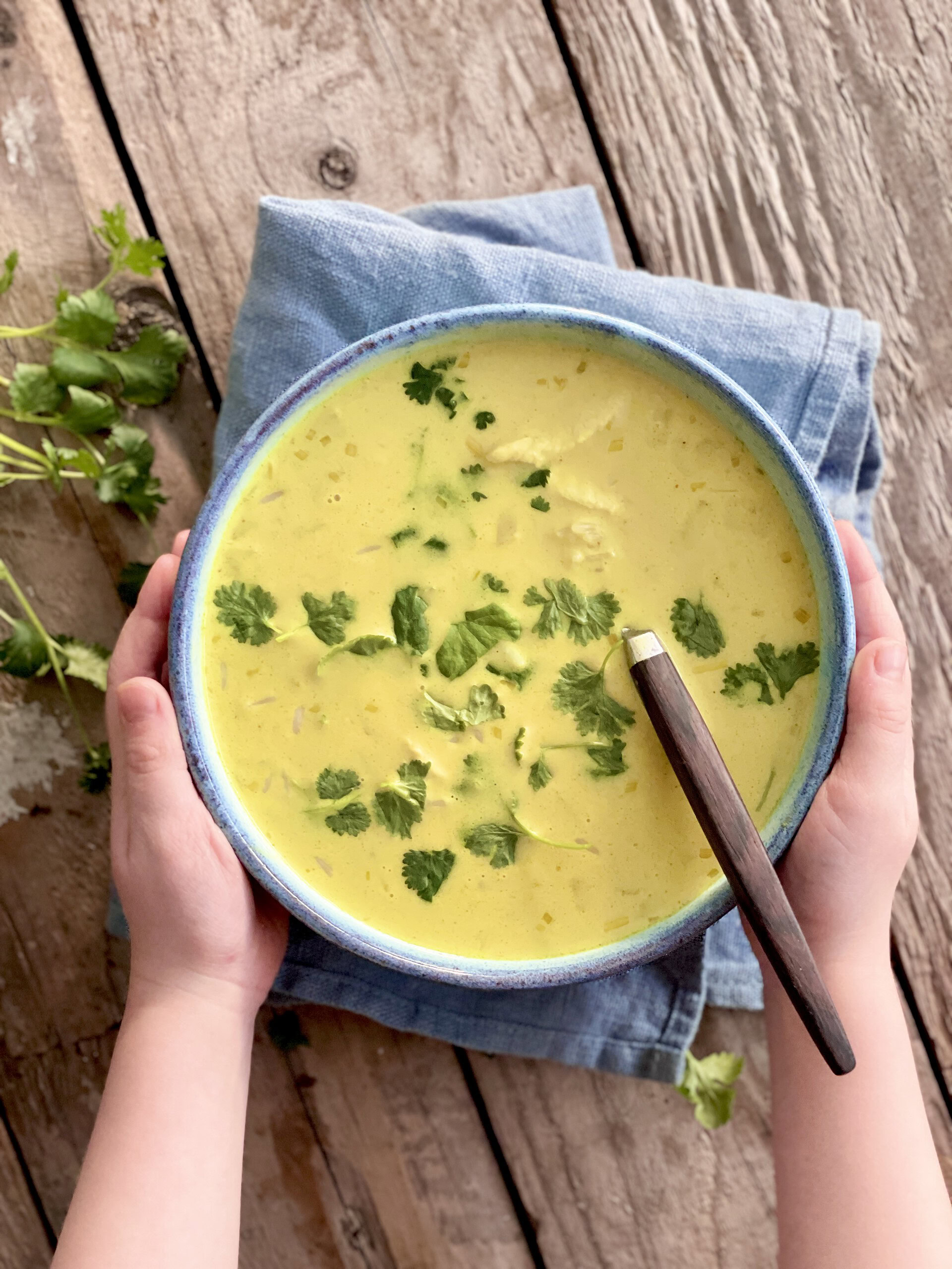 Suppen har et asiatisk strejf fra både citrongræs, ingefær, kokosmælk og koriander. Kan serveres som den er eller med lidt flute til.