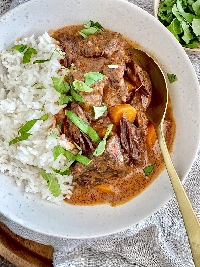 Simreret med okse, tikka masala og kokosmælk