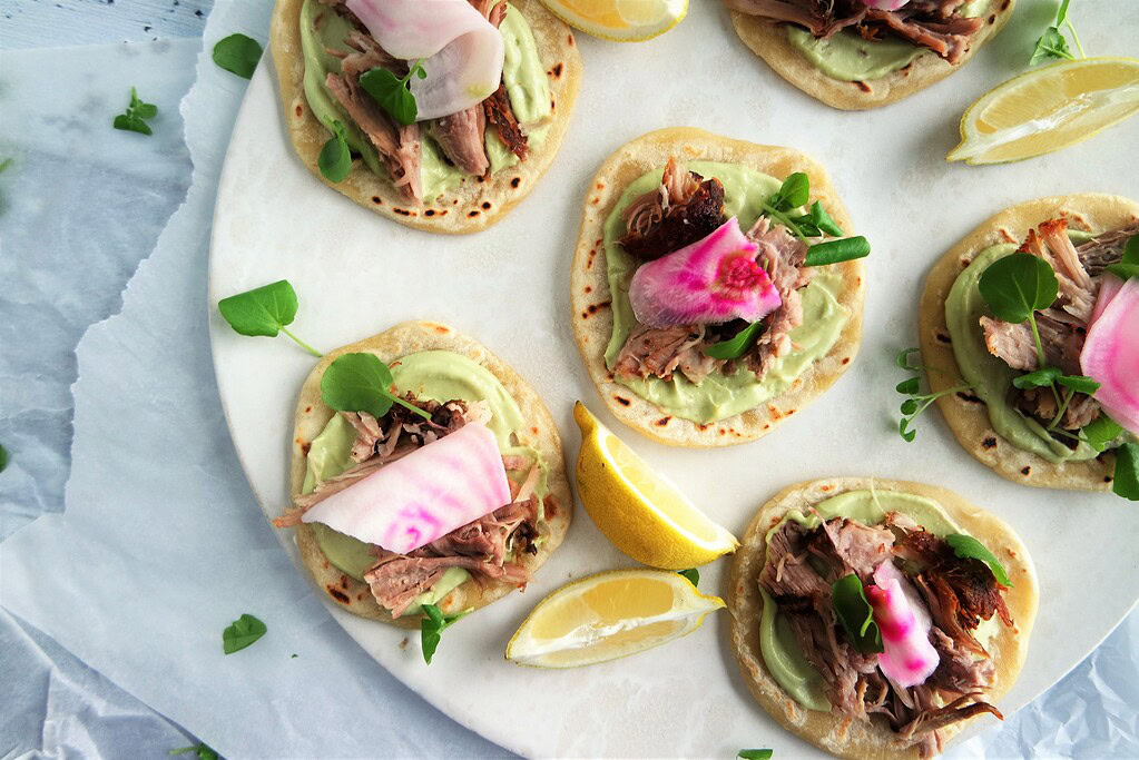 Mini tortilla med avokadocreme, pulled pork og syltet bolchebede