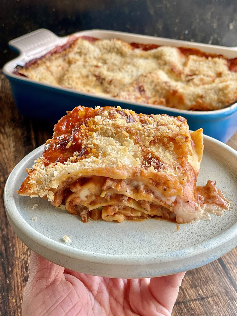 - Til slut skal lasagnen samles. Start med et lag kødsovs i bunden, derefter bechamelsovs og lasagneplader. Fortsæt således. Afslut med et lag bechamelsovs og drys med rasp og det sidste parmesan