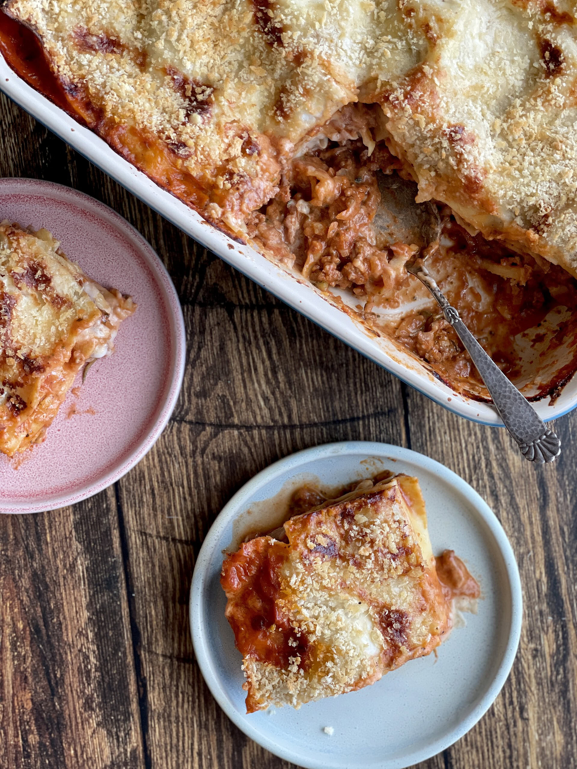 Herhjemme elsker vi lasagne, så derfor har jeg eksperimenteret med at lave én, der var fyldt med grøntsager OG som børnene stadig elsker. Det er virkelig lykkedes med denne her. Grøntsagerne bidrager med smag, men tildels blendet med tomatsovsen og derfor god til at få spist mere grønt.