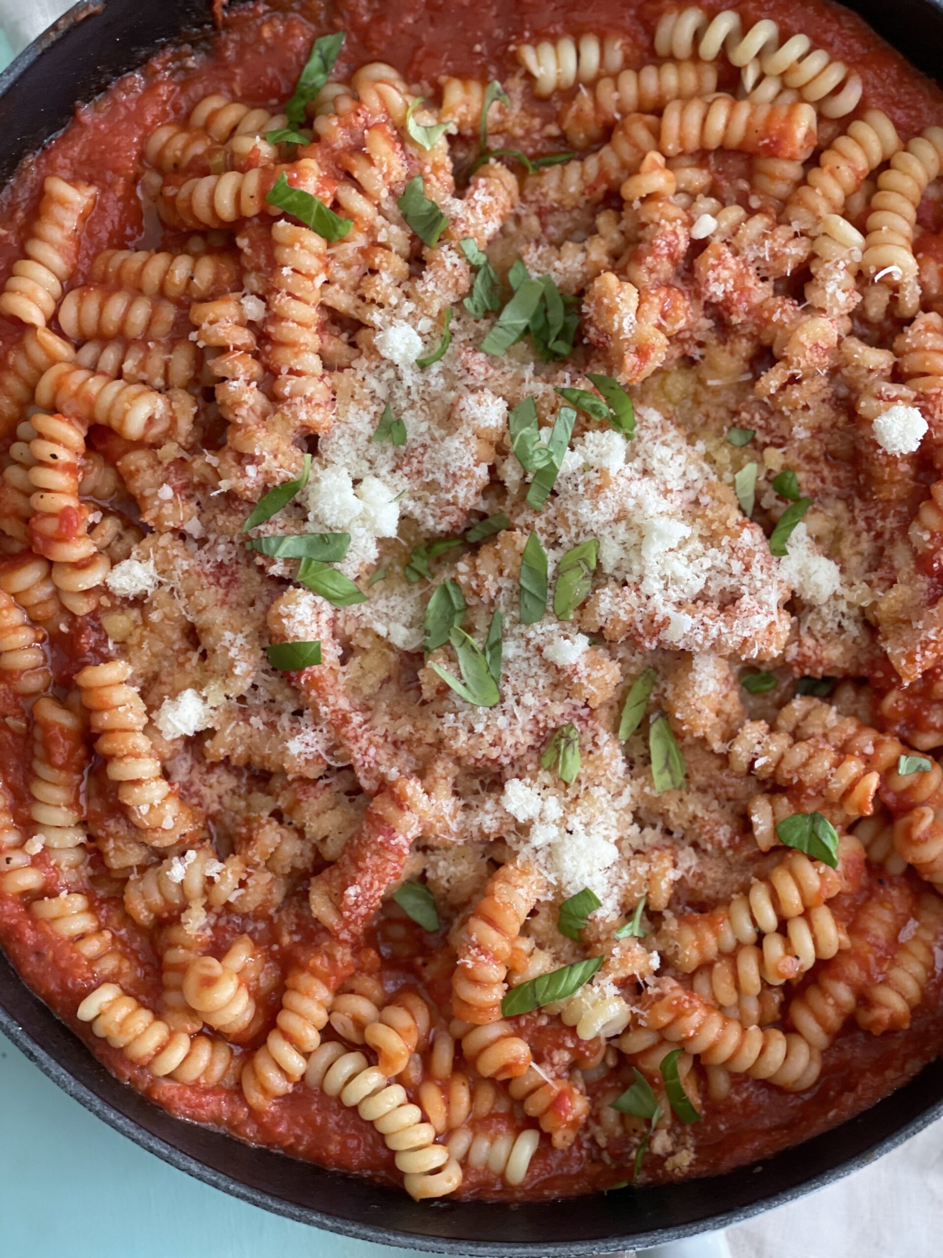 En simpel pastaret uden kød, men med masser af smag. Den er kendetegnet ved at indeholde chili, men af hensyn til børnene – drysses chili på ved servering. Den er ikke særlig dyr i ingredienser og fyldt med grøntsager. Sovsen med grøntsagerne bliver blendet, så de mindste kan også være med.