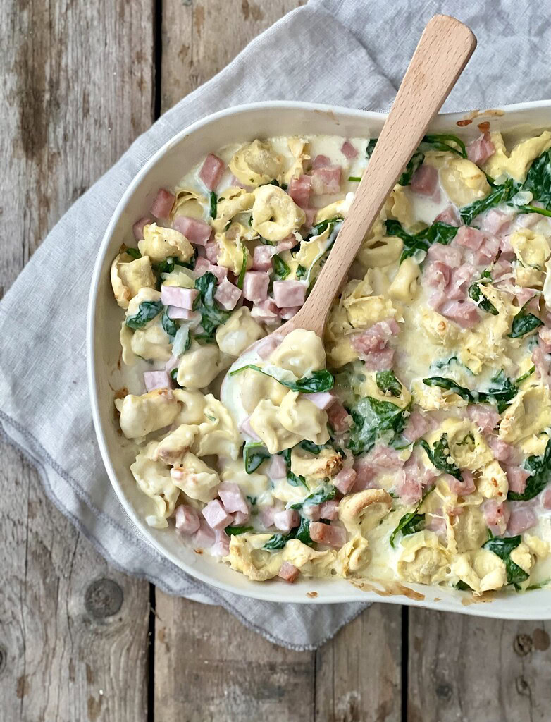 Bagt tortellini i ovn med skinke og spinat