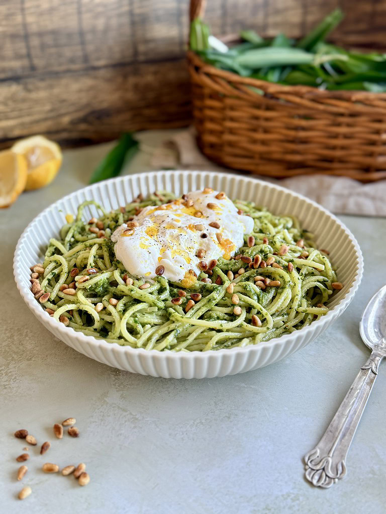 Jeg elsker gode simple pastaretter og denne lækre pasta med ramsløgspesto og burrata er ingen undtagelse. I forårsmånederne vrimler det ofte med ramsløg i skovbunden, som man frit kan tage ud at plukke med sin familie. Det er både en hyggeligt aktivtet, men også læring ift. ‘fra jord til bord’. Der er mange måder at bruge ramsløg på i madlavning f.eks. i omelet, i pastasalater, i kartoffelsalat med ramsløgsdressing eller blot som en lækker ramsløgspesto, som eks. kan bruges til tapas eller dip.