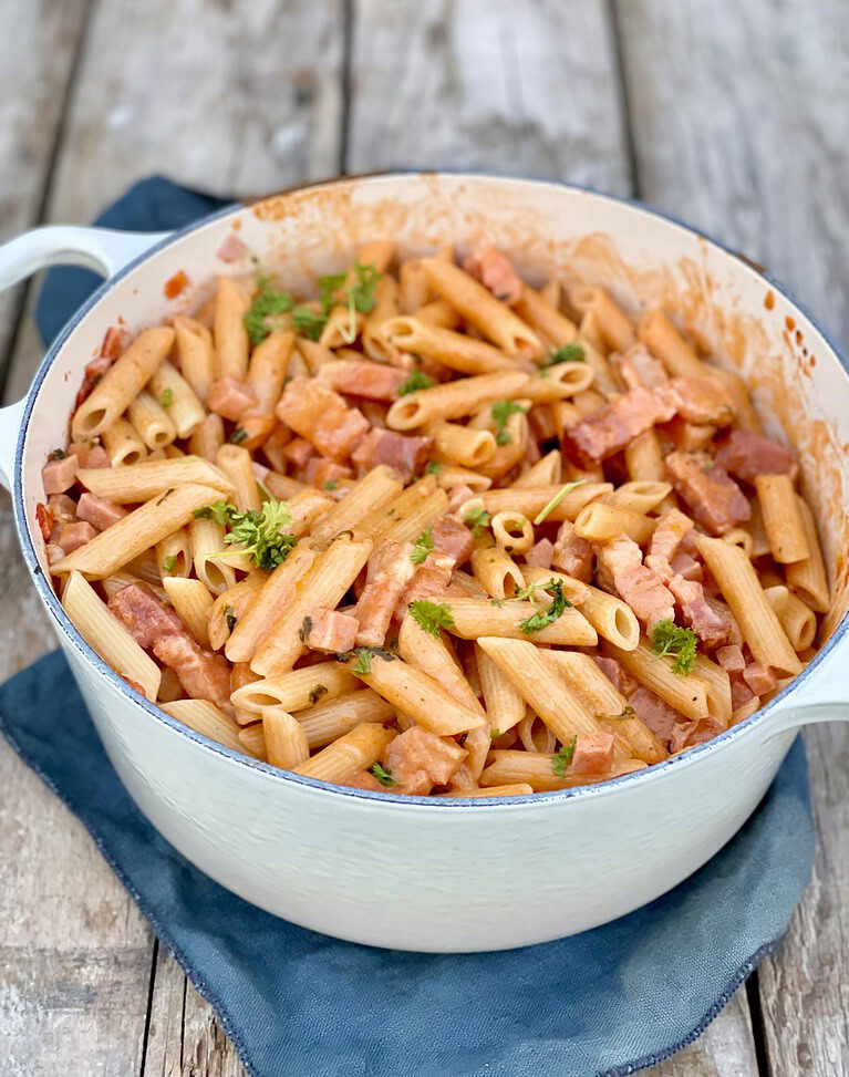 Hvis du er til cremet og smagfuld pasta, så må du endelig ikke snyde dig selv for denne ret. Lad dig endelig ikke afskrække af at der skal vodka i, da alkoholen fordamper under tilberedningen. Vi serverede for gæster og både børn og voksne spiste flere portioner.
