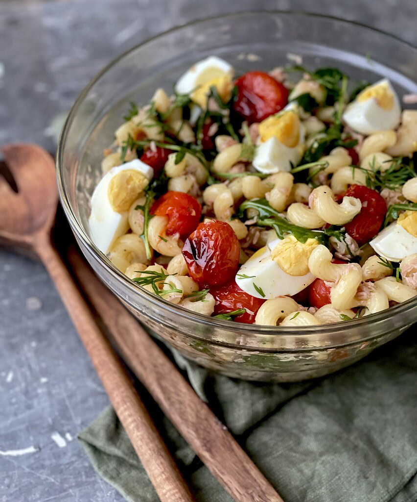 Pastasalat med tun, bagte tomater og olie/eddike dressing