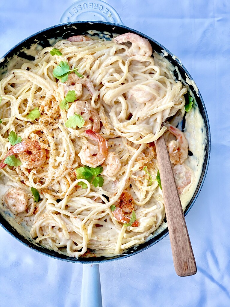 Cremet linguine med tigerrejer