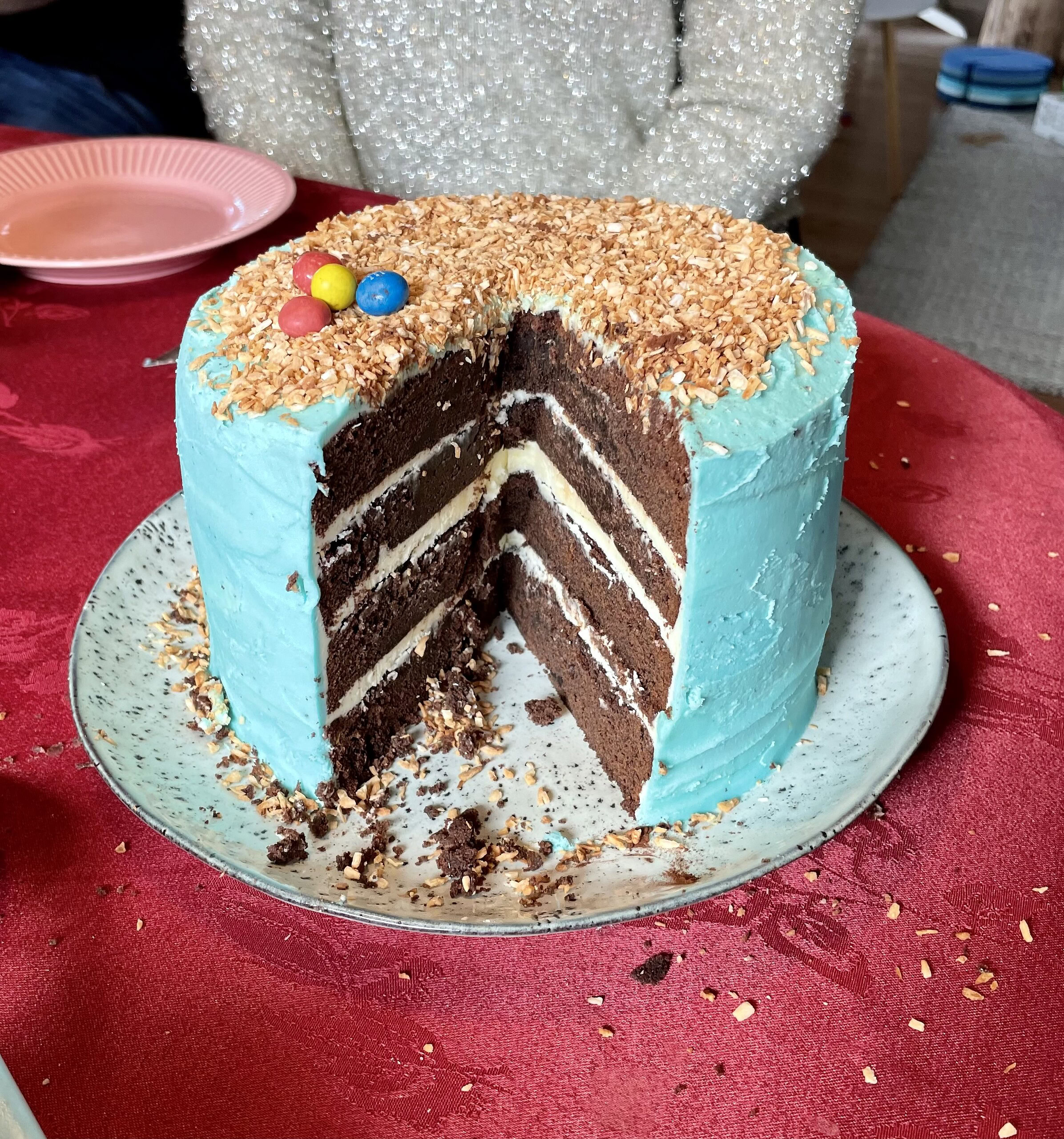 Hvis du ønsker en mere simpel version, kan du evt droppe at smøre op med den blå frosting og blot have kagen uden opsmøring eller smøre op med en smule af den hvide chokoladecreme.