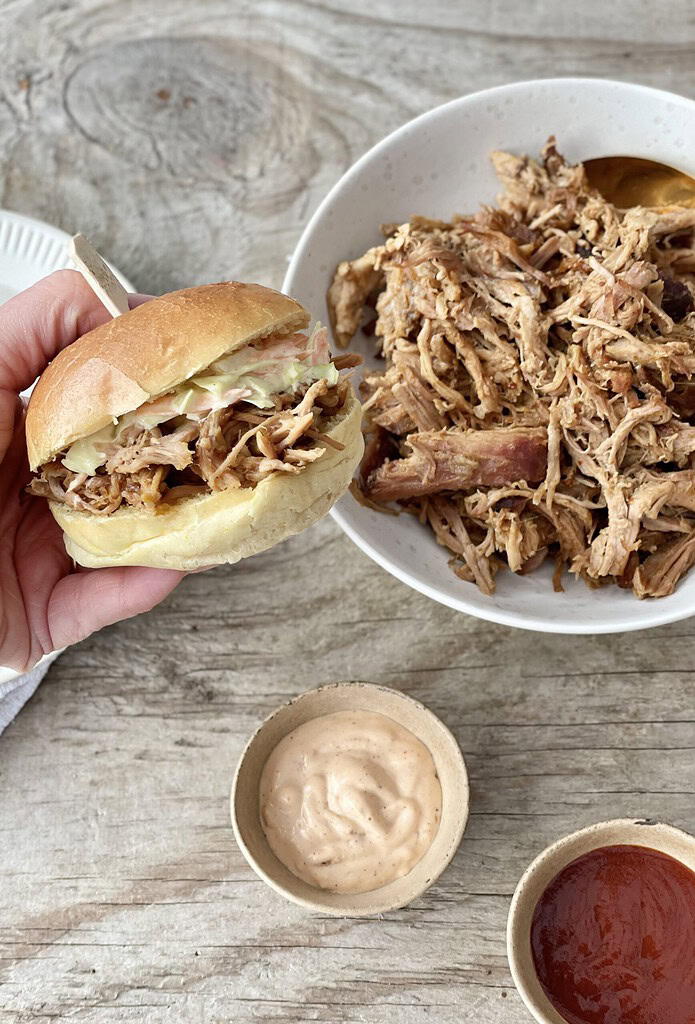 - 400 g pulled pork (du kan enten købe en købeversion eller lave selv, se link ovenover)