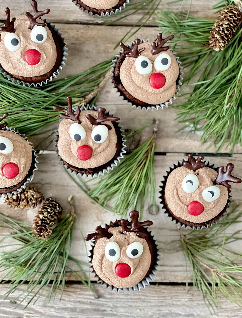 Her er et alletiders bageprojekt til jul, som helt sikkert vil skabe juleglæde hos børn og barnlige sjæle. Kager og creme er super nemt at lave. Det sværeste er at lave chokolade gevirerne. Næsen er blot Smarties (fra bland selv) og sukkerøjne. Jeg købte dem i Rema1000. Men ellers har de større supermarkeder dem.