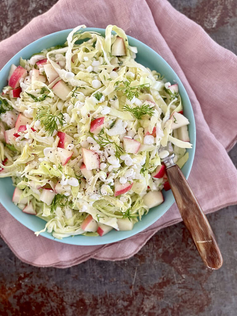 Min nye yndlings spidskålssalat. En fantastisk alsidig salat, som også vil være godt til gæstemad. Jeg kan godt synes, at mynteblade i salat bliver for dominerende og voldsomt, men i denne vinaigrette (dressing) er den blendet og bidrager med en friskhed uden at overdøve det hele!