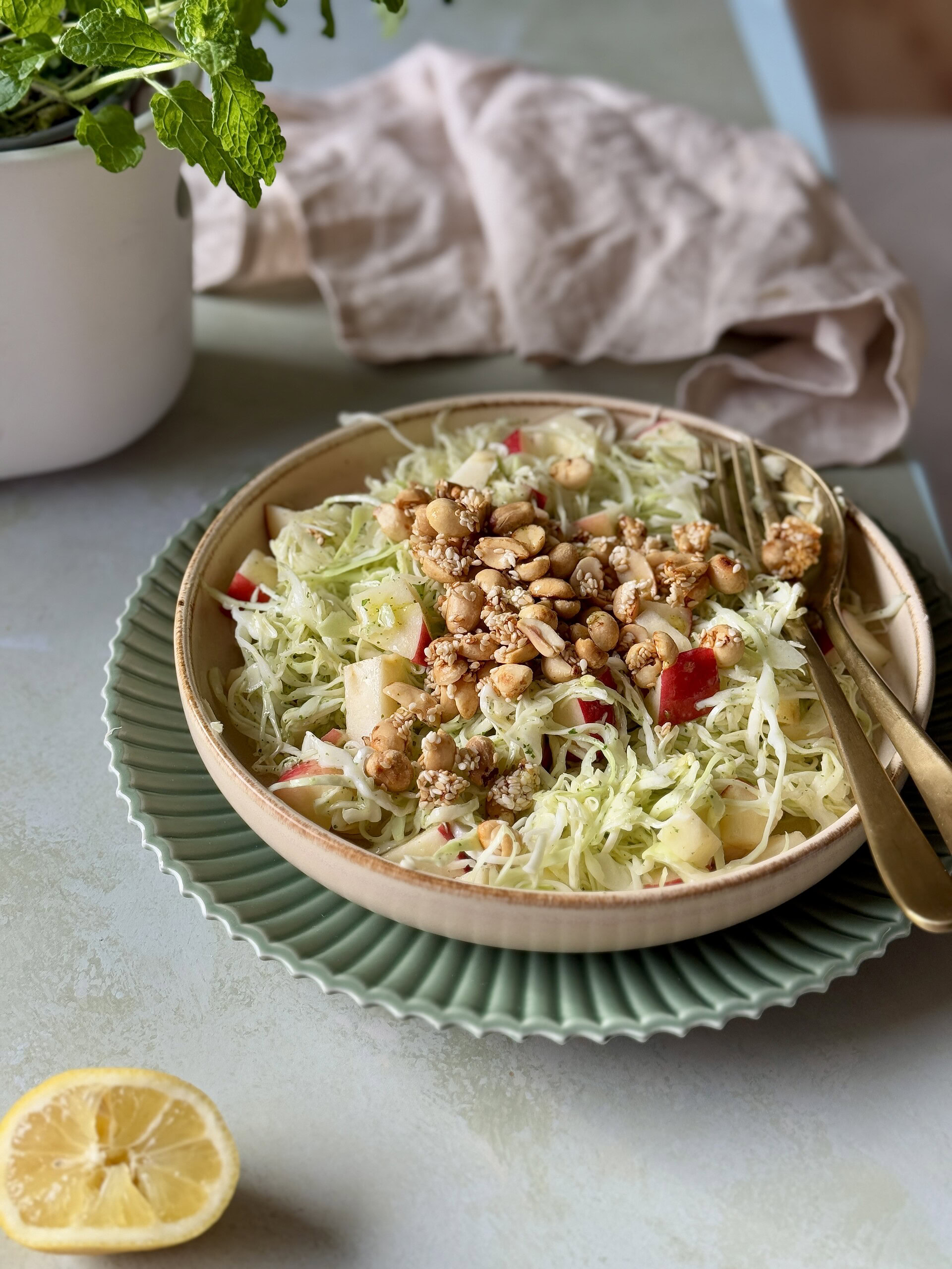 - Vend kål, æble, nødder og dressing sammen i en skål og server (laves salaten i god tid, så lad nødderne ligge tørt i en skål eller lignende og kom først på ved servering).