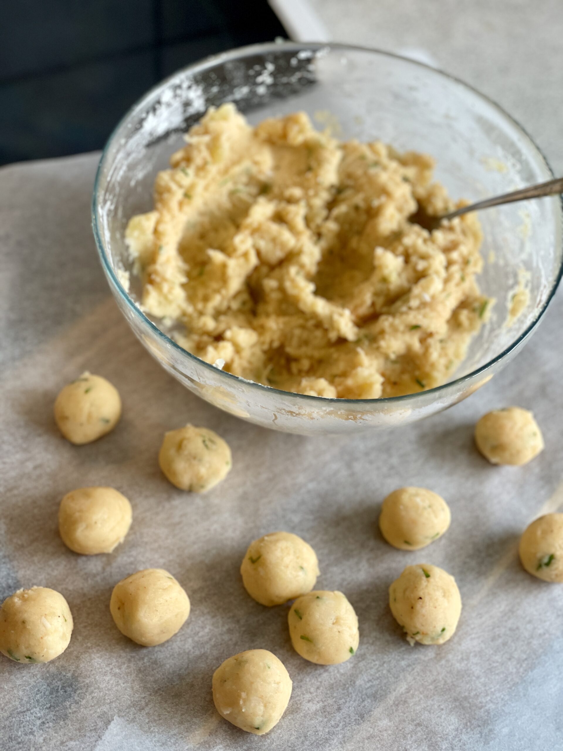 - Form kartoffelmassen til små kugler (evt med en teske) og kom 5-7 stykker i olien af gangen.