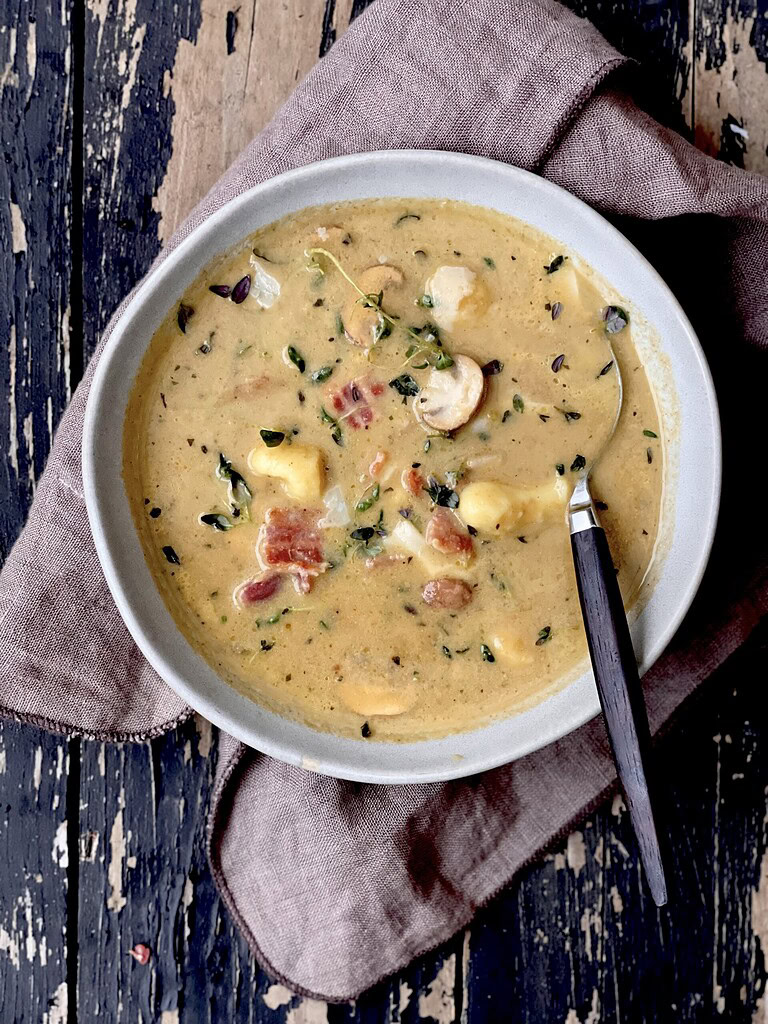 Jeg er vild med gnocchi, men du kan også komme kartoffelstykker eller pasta i. Skal du have en kødfri dag, så undlad blot baconen.