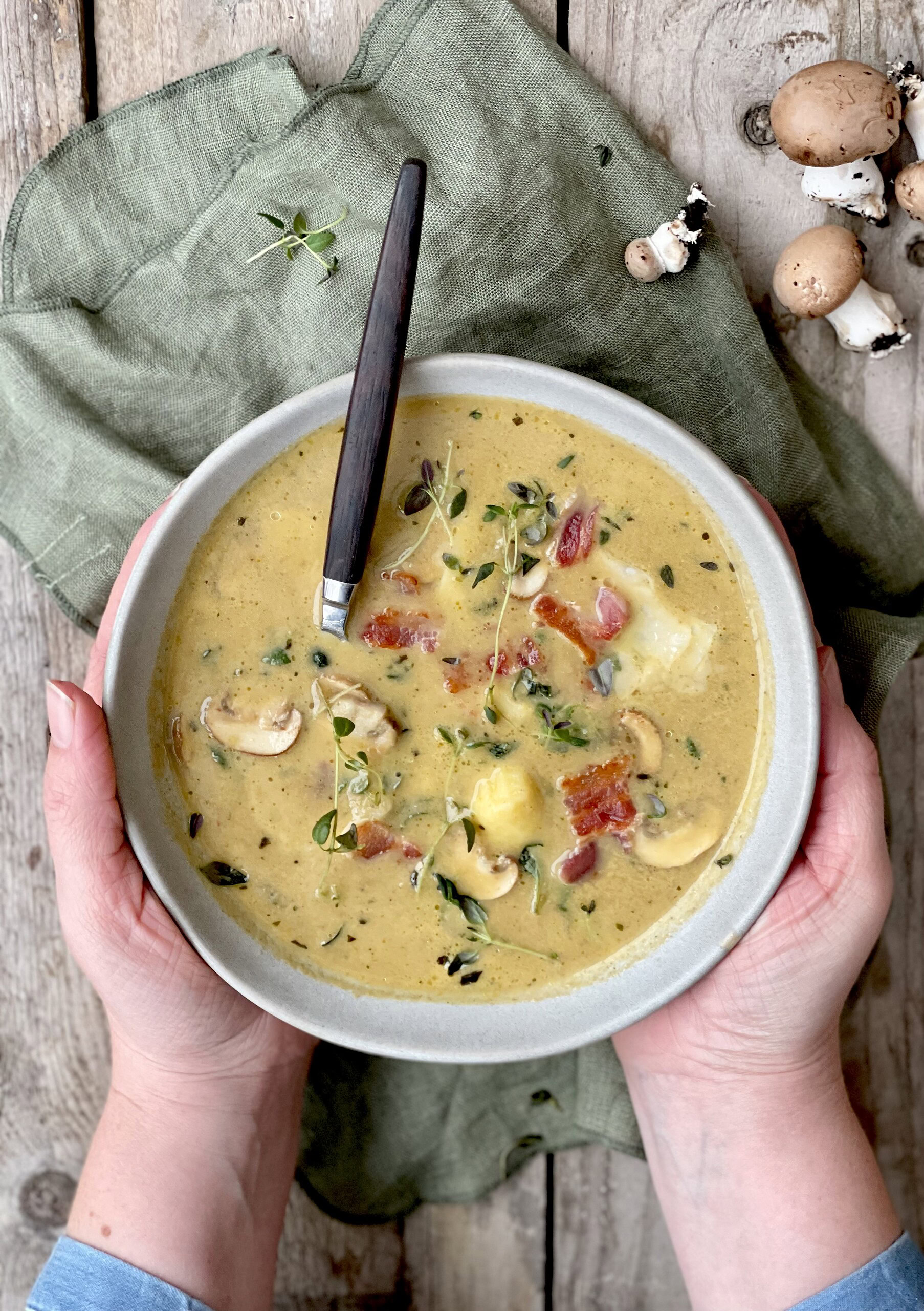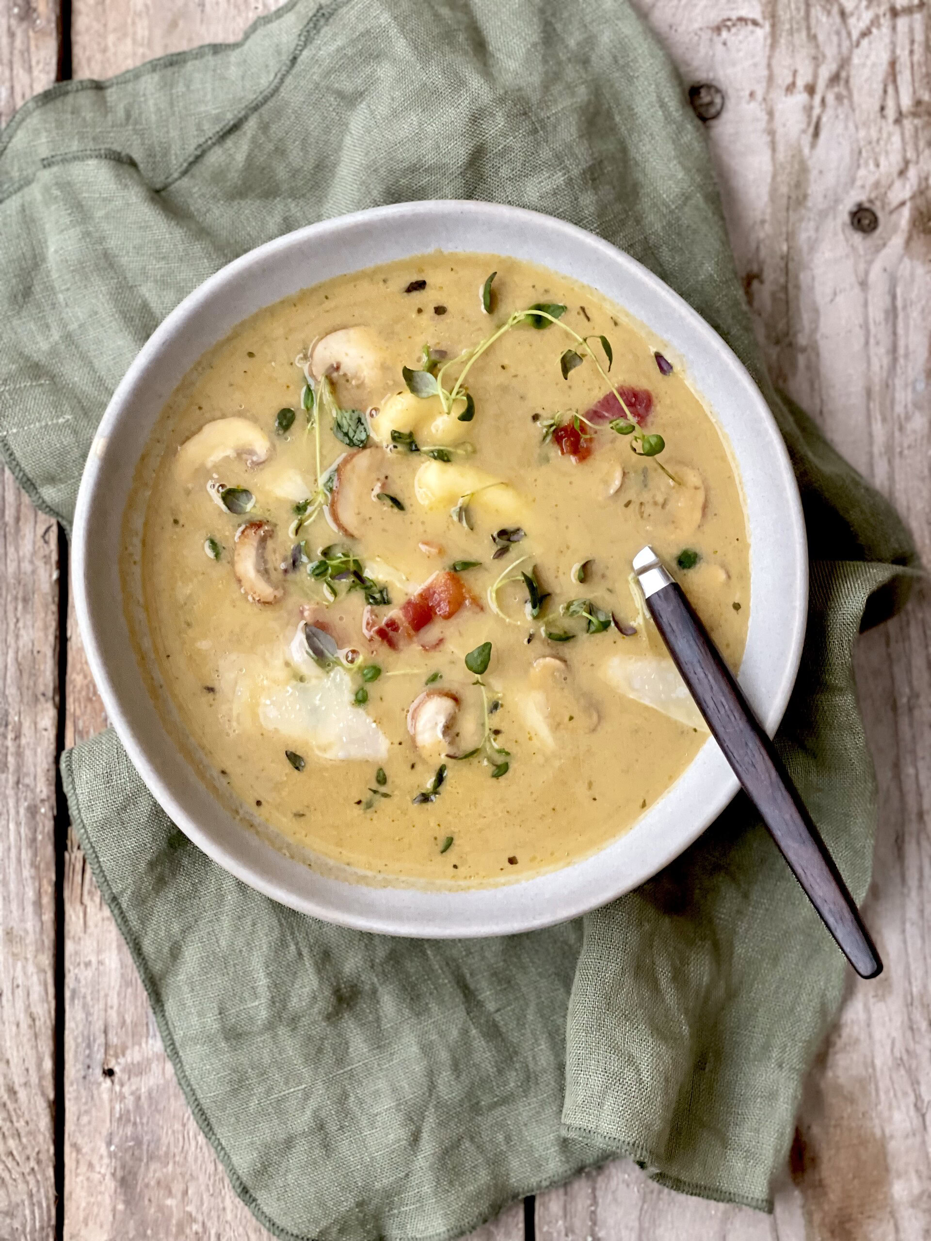 En skøn vinterret med brune champignon, som er i sæson. Den indeholder generelt mange grøntsager, som bliver blendet- så den kan spises af alle.