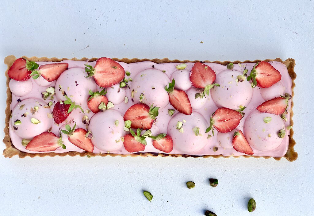 Jordbærkage med moussekugler