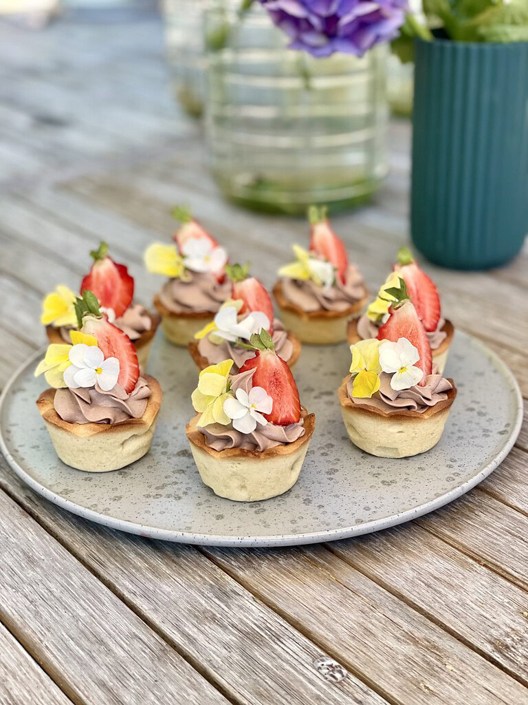 Små tærter med mazarin, kakaocreme og bær