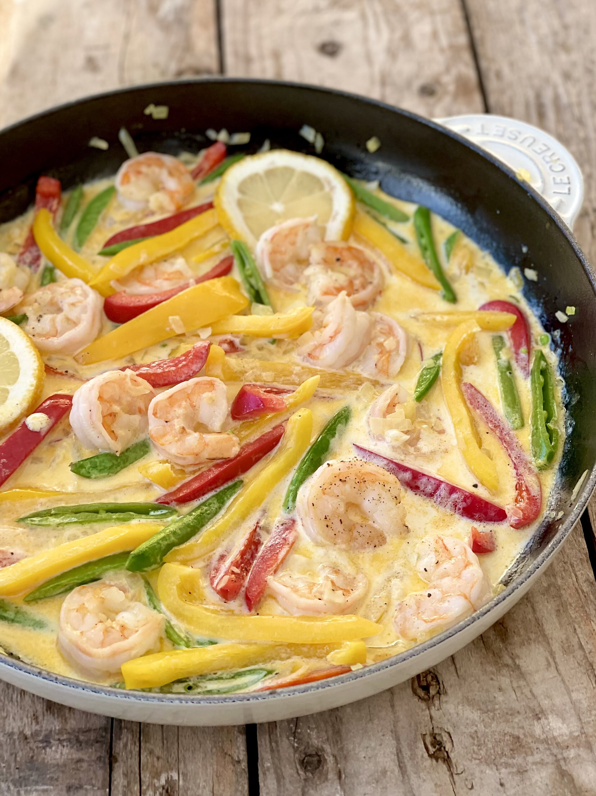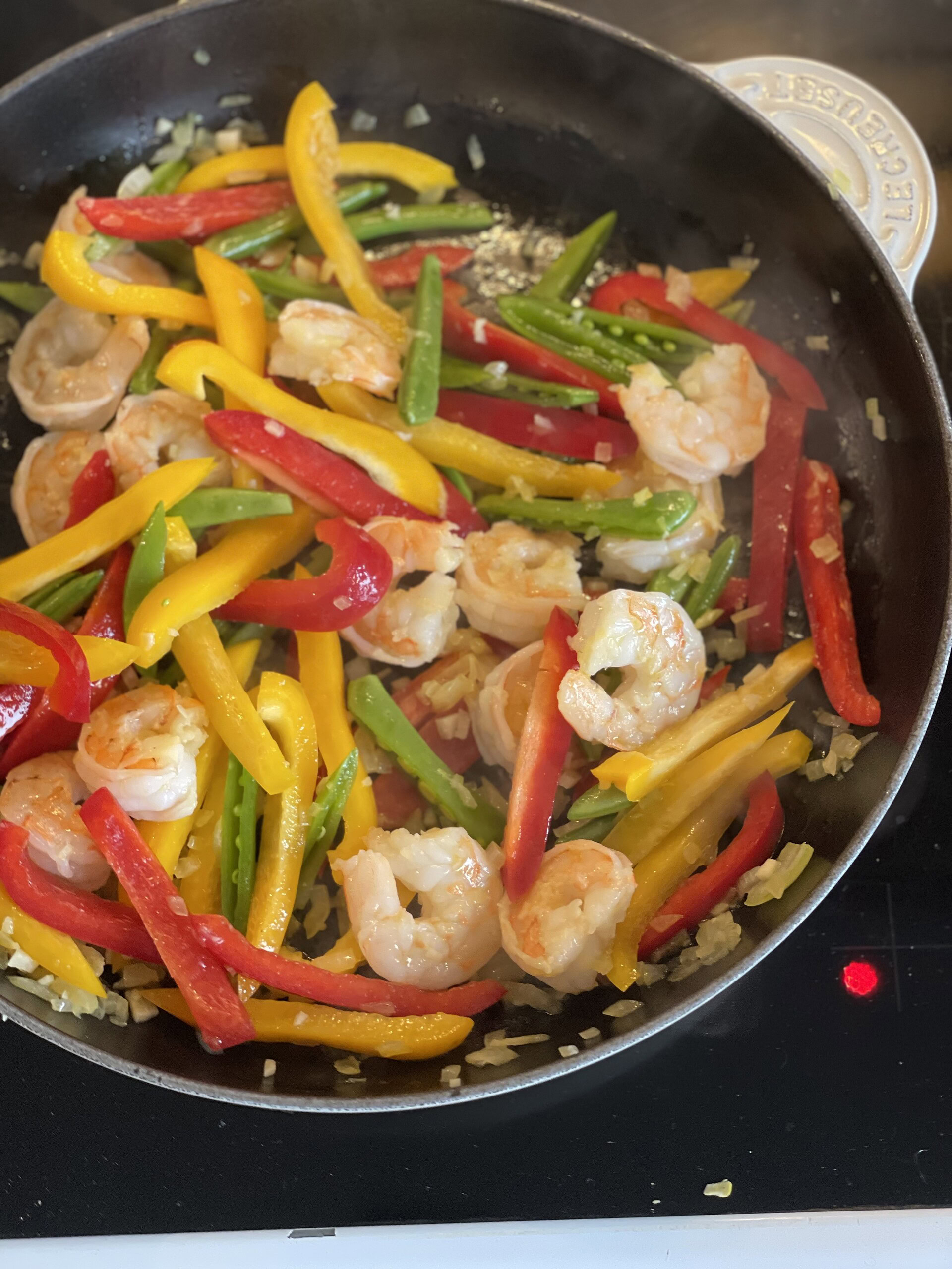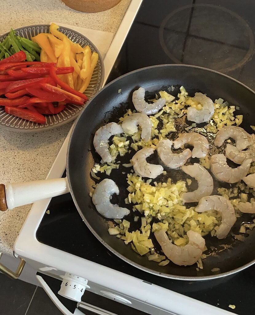 - Tilsæt nu tigerrejer, hvidløg, peberfrugt og slikærter og svits i ca 1 min