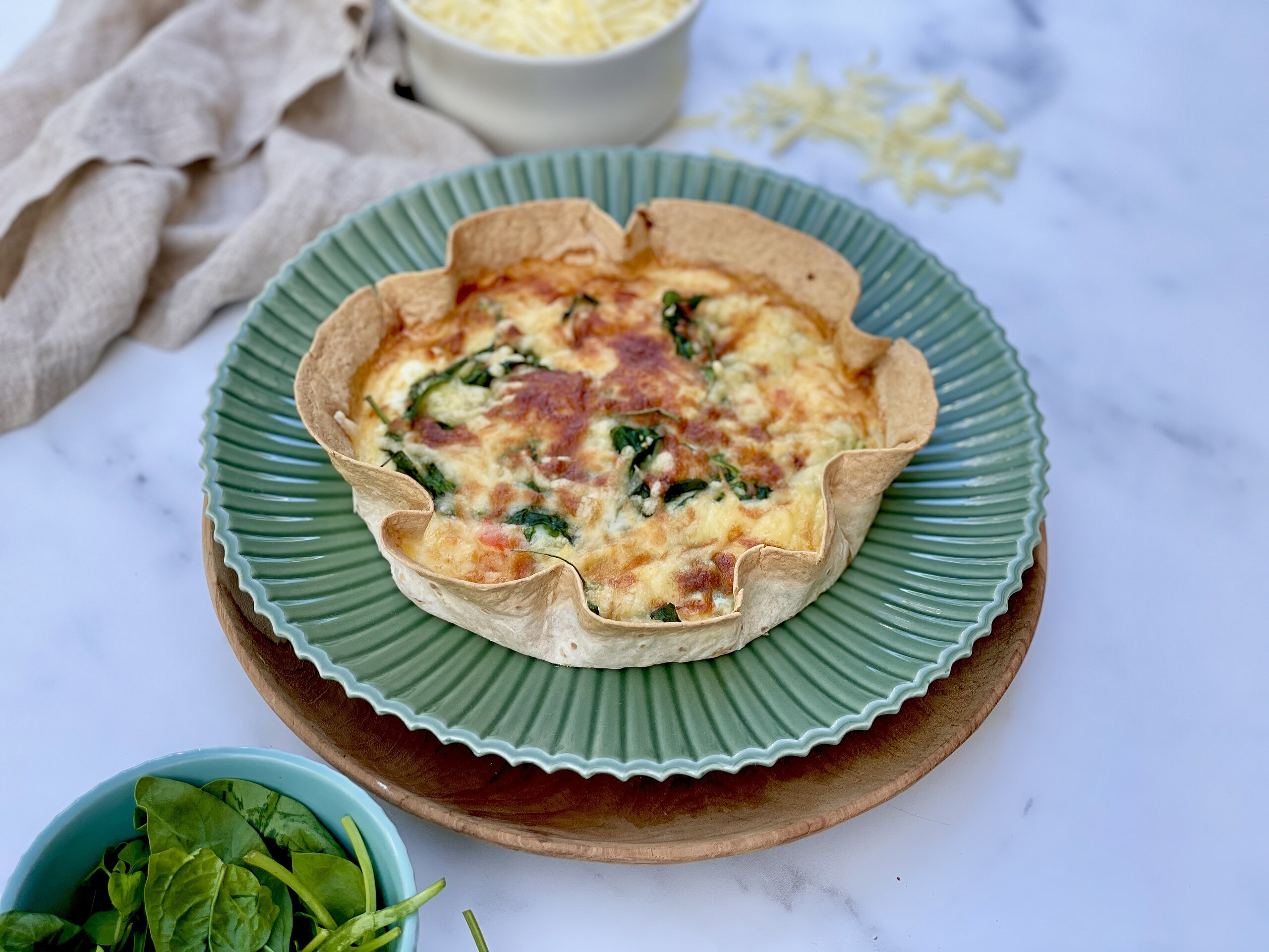- Kom tortillaen ned i et lille fad (form der passer i airfryer eller lille tærtefad) så der bliver dannet en kant i siden