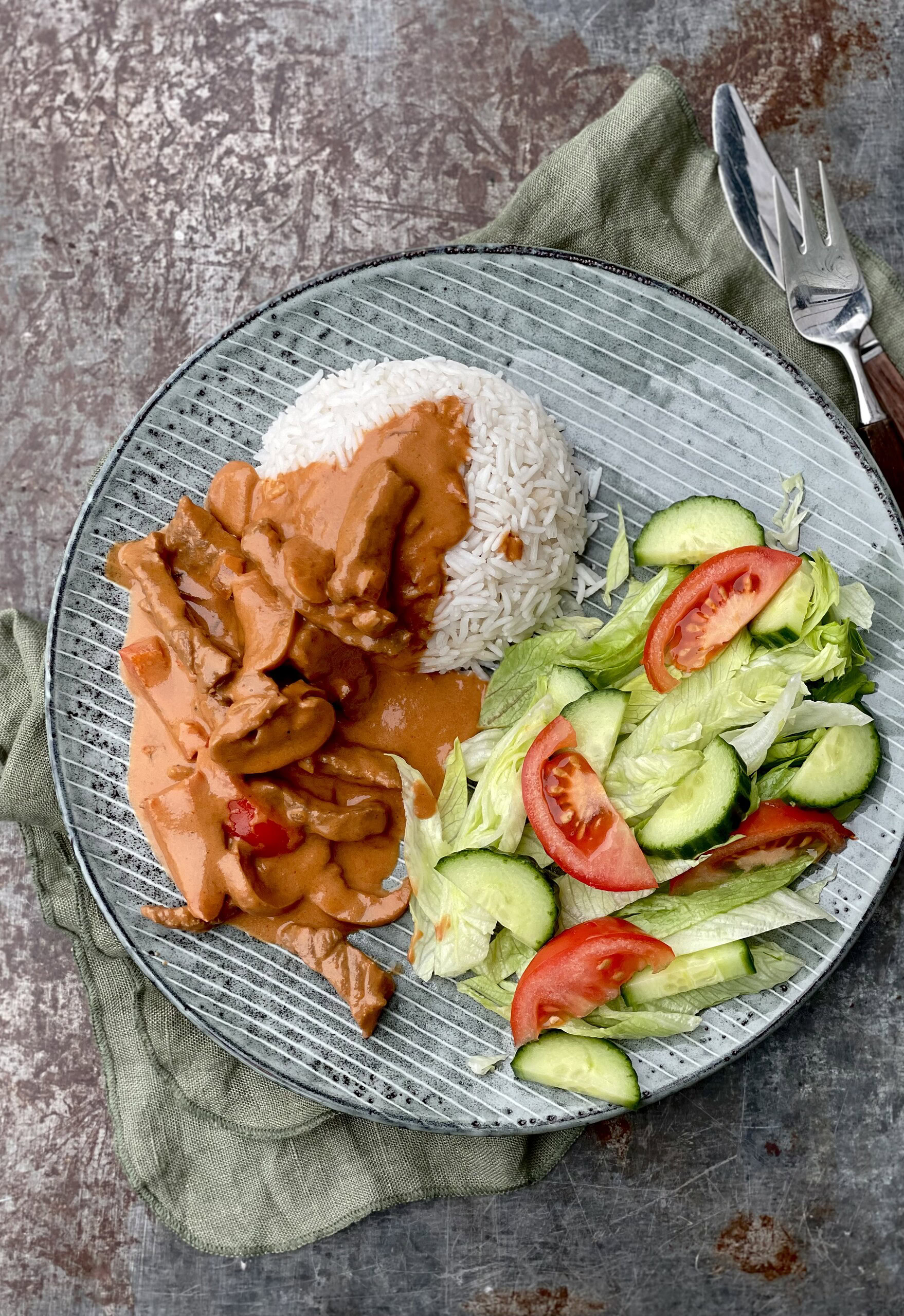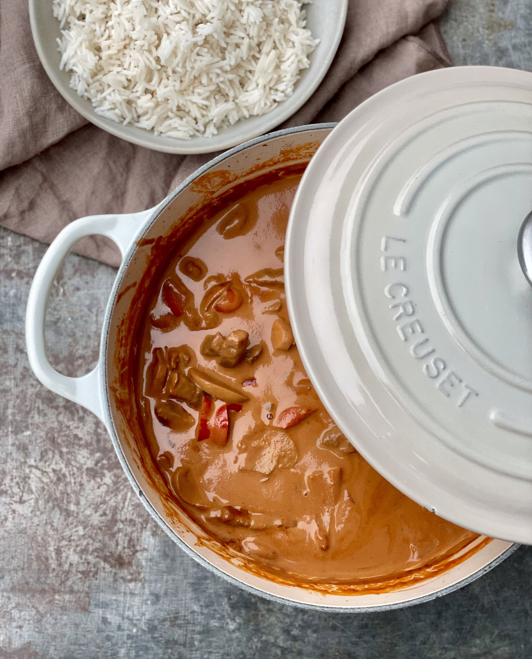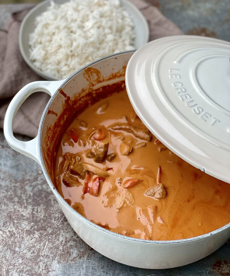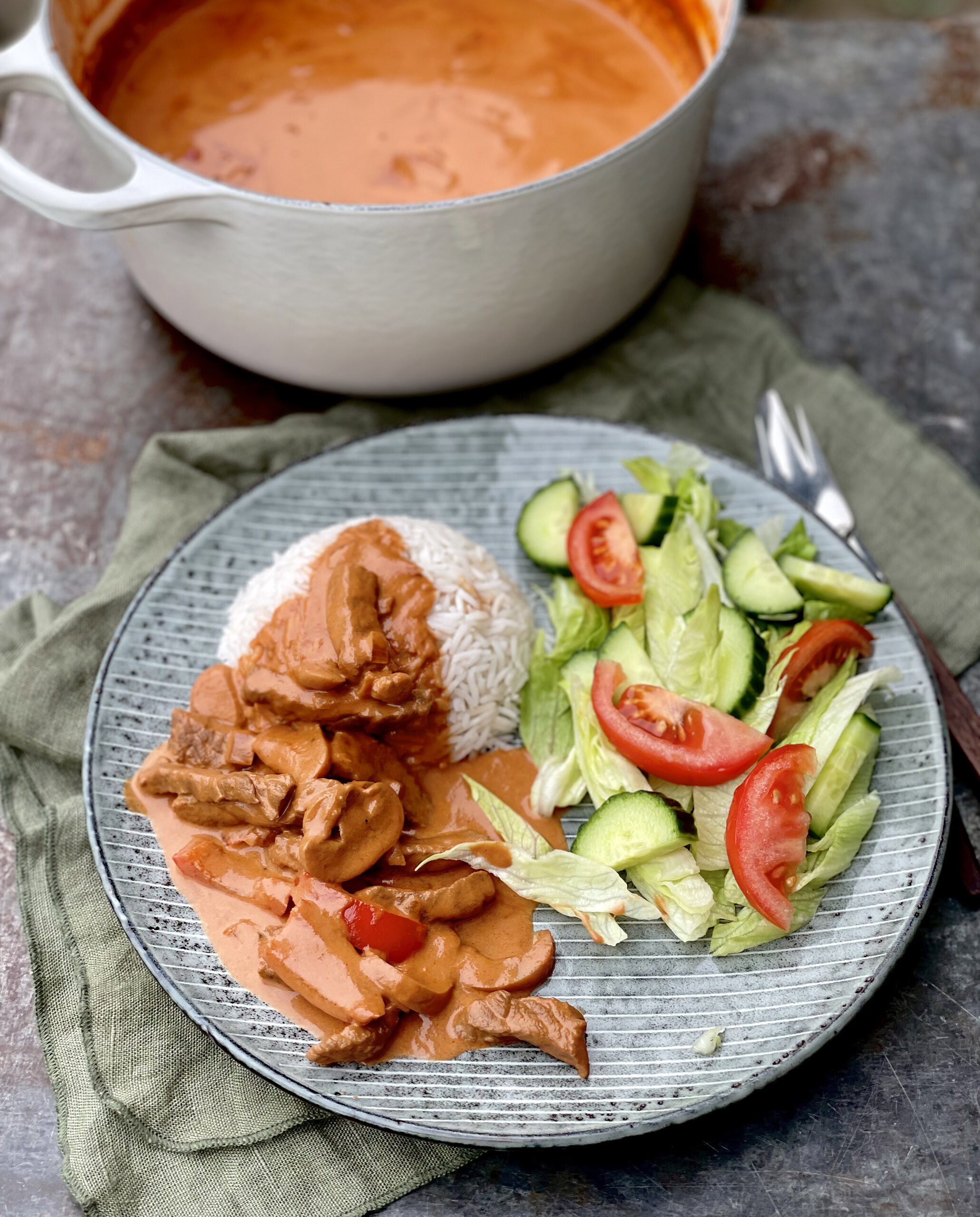 Er i gang med at lave, og det kommer til at blive godt, er jeg sikker på! Gætter dog på, at kødet skal i gryden igen i punkt 5, selvom det ikke står der – ellers bliver det svært at få mørt 😉 Og mon ikke også, peberfrugten skal skæres, selvom det ikke står der, eller skal den hel i? 🙂 Tak for lækker opskrift!